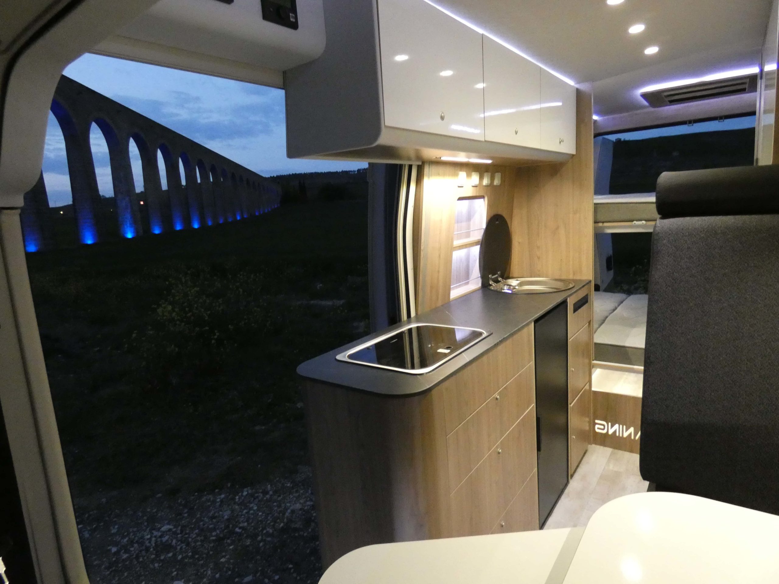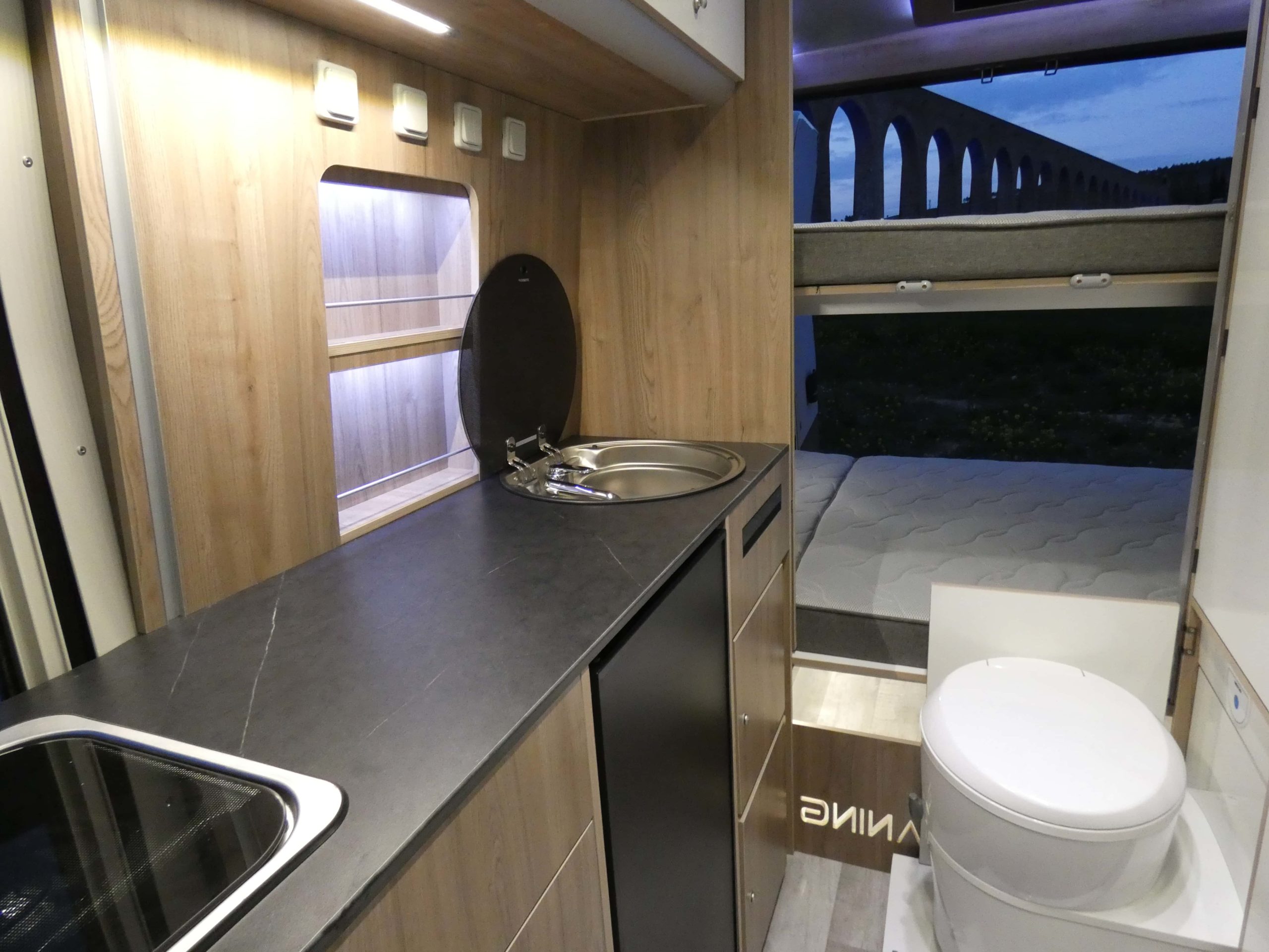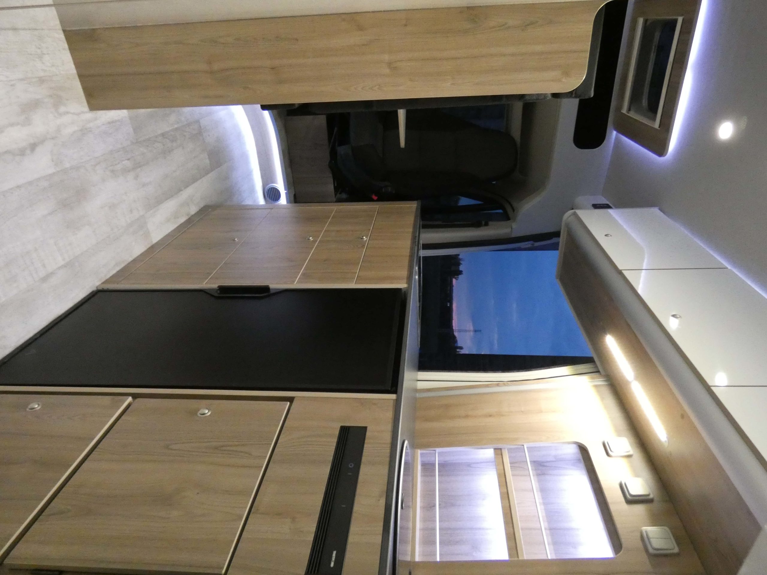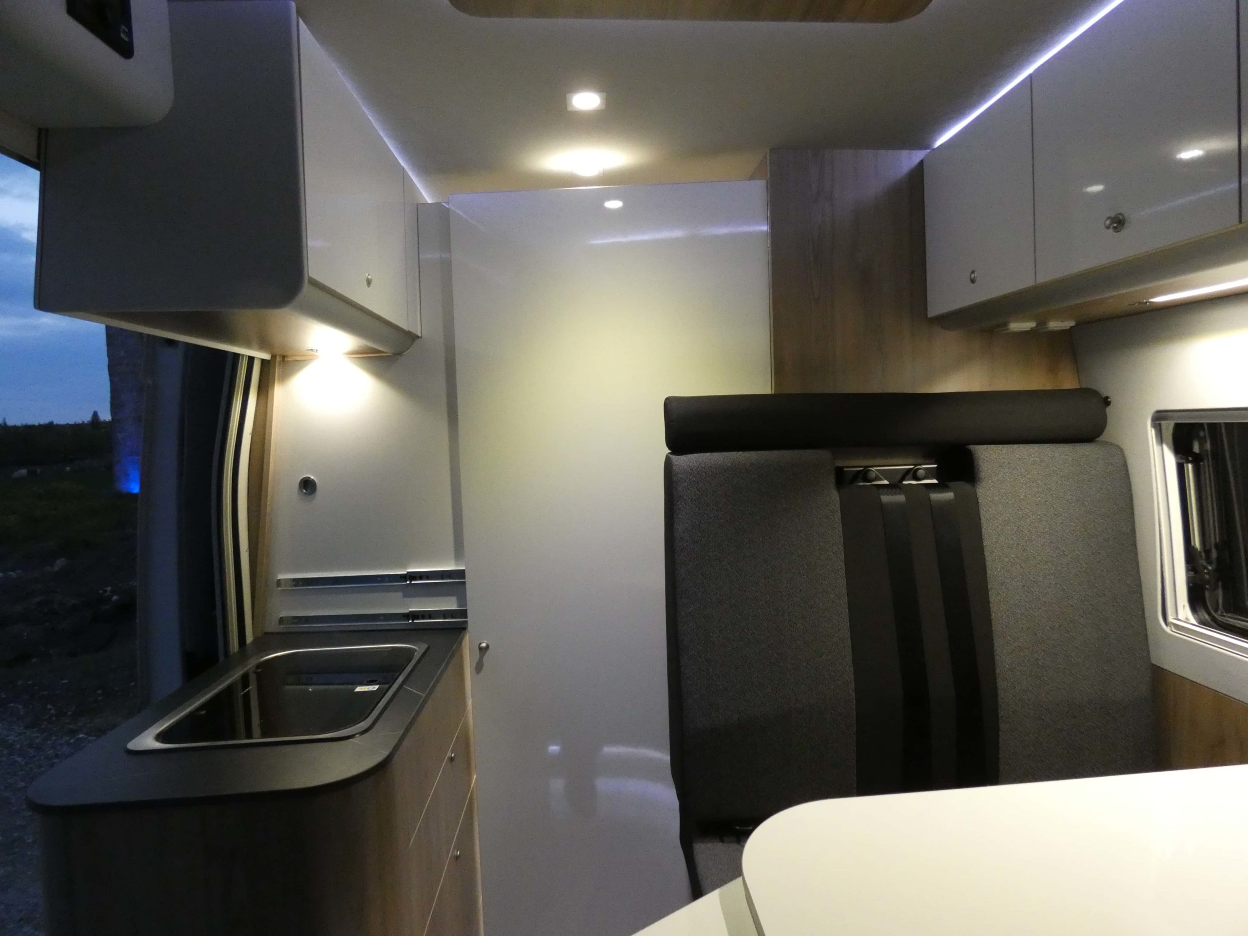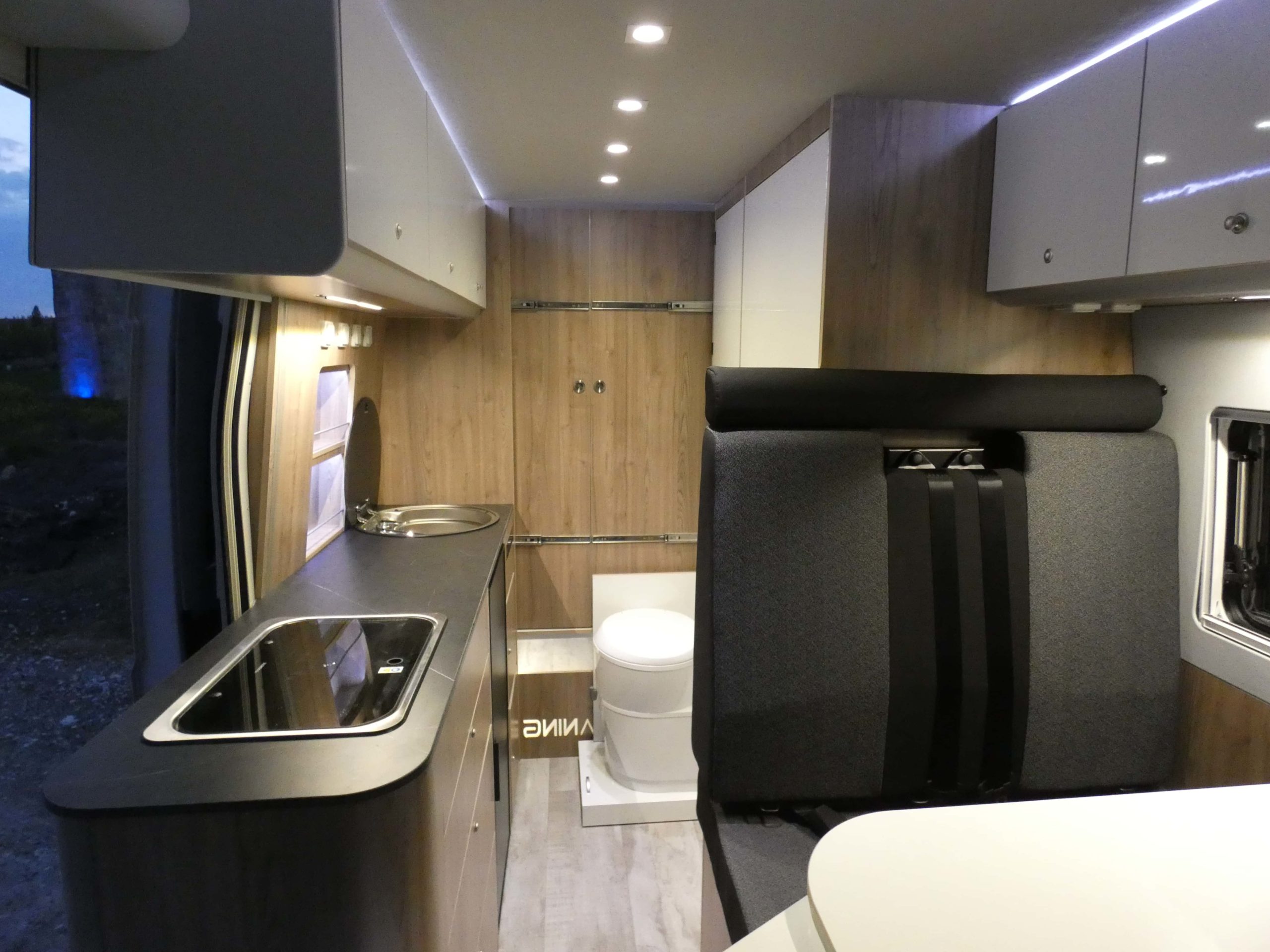 Esta furgo se caracteriza por su iluminación indirecta, aqui también incluimos nuestro BAÑO/VESTIDOR DE 2 METROS CUADRADOS, para ello utilizamos el pasillo gracias a las puertas correderas que nos separan de las camas y la puerta de la cabina de ducha que nos cierra hacia el comedor, de esta manera conseguimos un armario ropero de 40 cm de ancho, y una cabina de ducha de 60 x 65 cm dotada de mampara enrollable, hemos convertido en móvil un wc fijo con cassette extraíble desde el exterior, al dotarlo de movilidad lo podemos guardar cuando no lo usamos, el fregadero hace también las veces de lavabo si así lo deseamos, cuando no tenemos la puerta de la ducha abierta conseguimos una encimera de 170 cm de largo para cocinar de una manera comodísima.