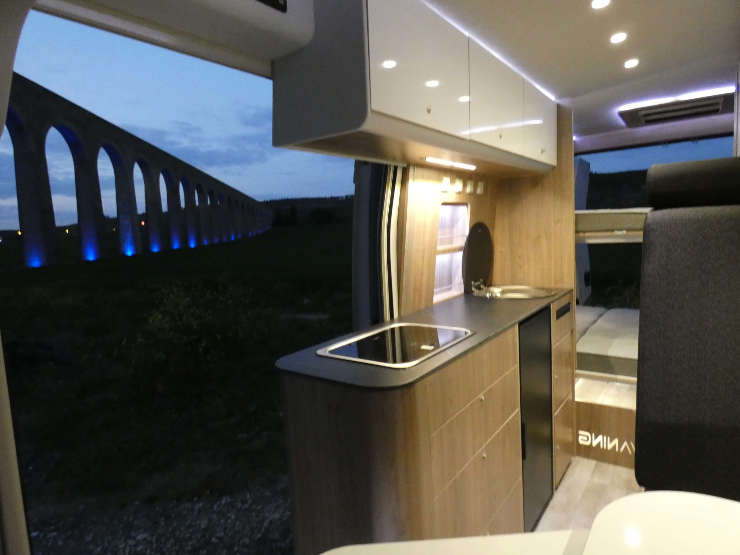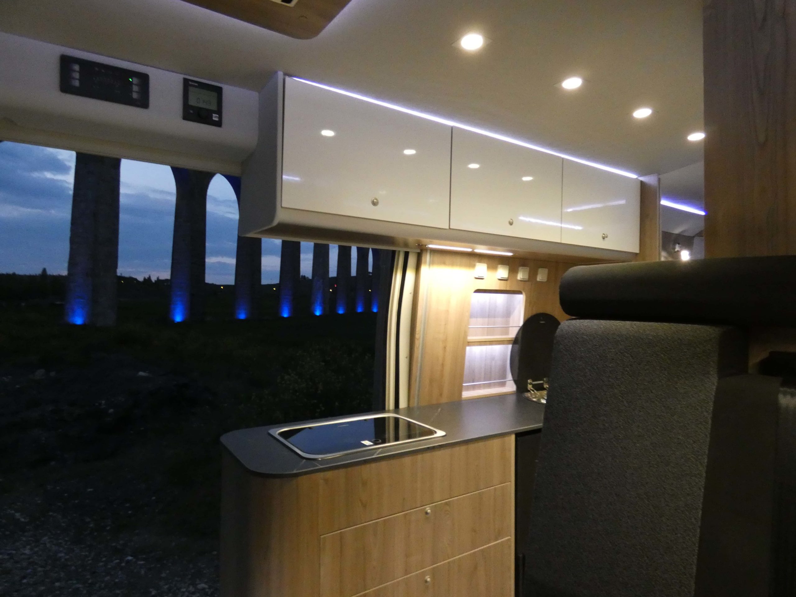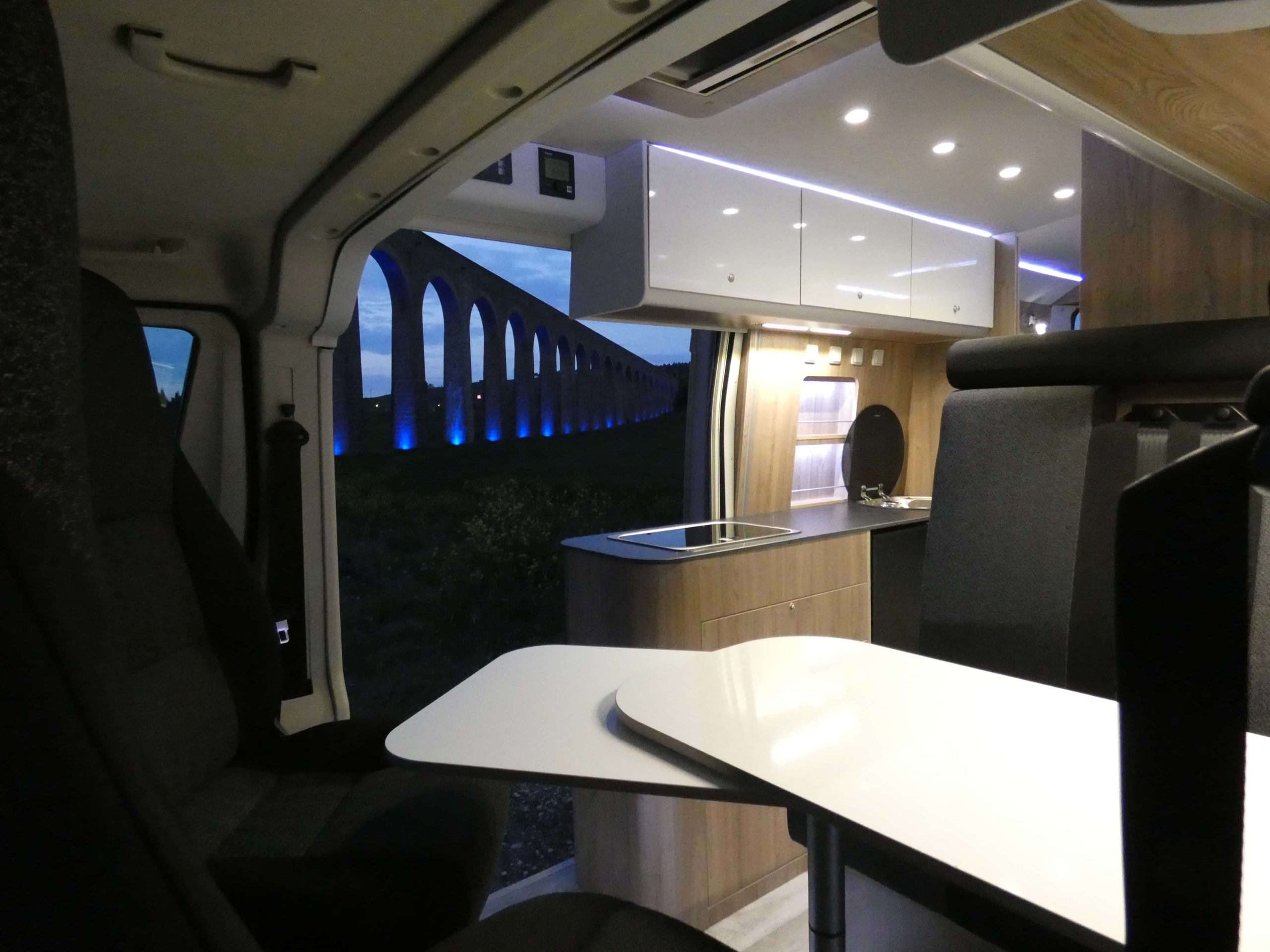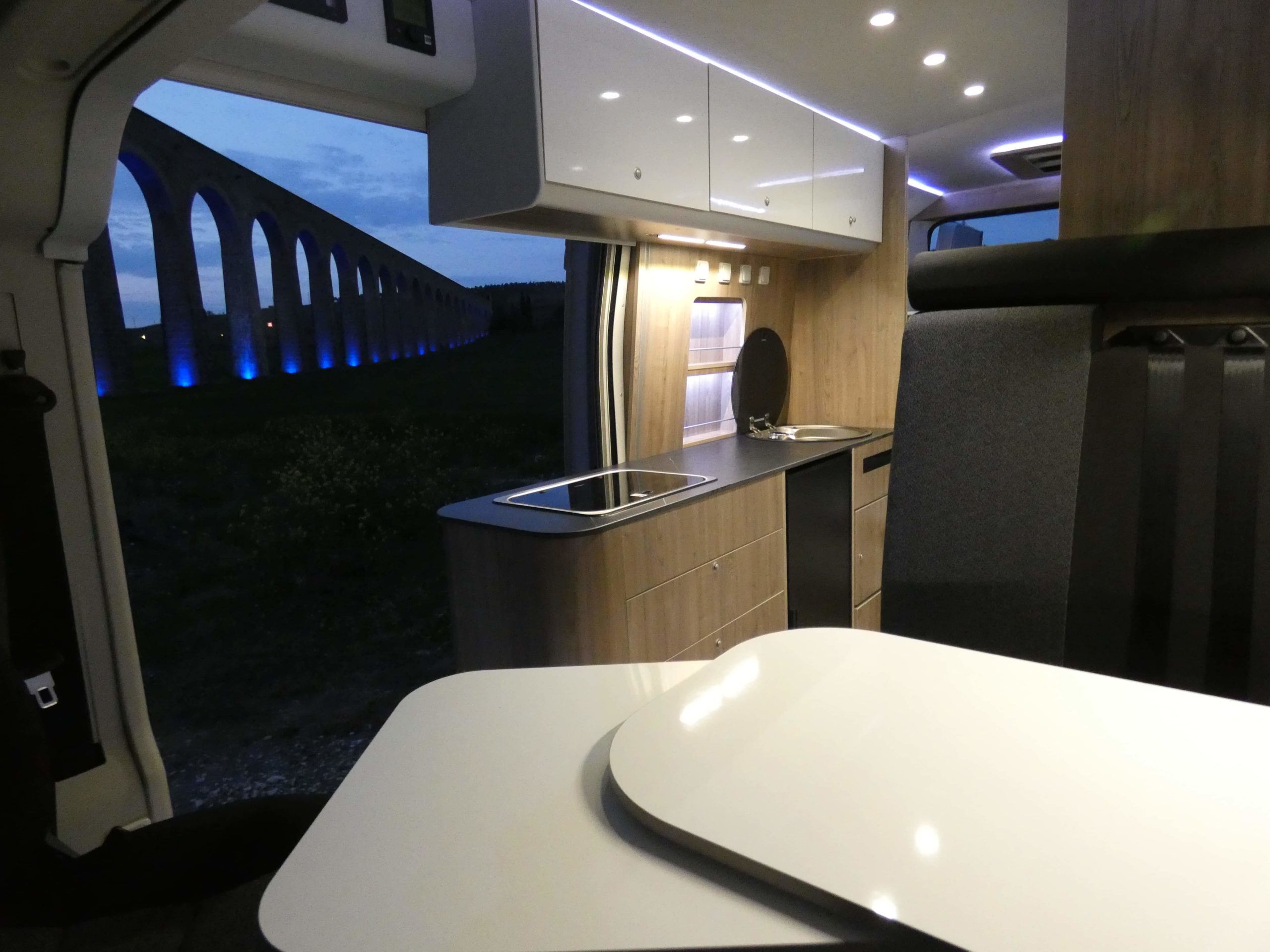 Esta furgo se caracteriza por su iluminación indirecta, aqui también incluimos nuestro BAÑO/VESTIDOR DE 2 METROS CUADRADOS, para ello utilizamos el pasillo gracias a las puertas correderas que nos separan de las camas y la puerta de la cabina de ducha que nos cierra hacia el comedor, de esta manera conseguimos un armario ropero de 40 cm de ancho, y una cabina de ducha de 60 x 65 cm dotada de mampara enrollable, hemos convertido en móvil un wc fijo con cassette extraíble desde el exterior, al dotarlo de movilidad lo podemos guardar cuando no lo usamos, el fregadero hace también las veces de lavabo si así lo deseamos, cuando no tenemos la puerta de la ducha abierta conseguimos una encimera de 170 cm de largo para cocinar de una manera comodísima.
