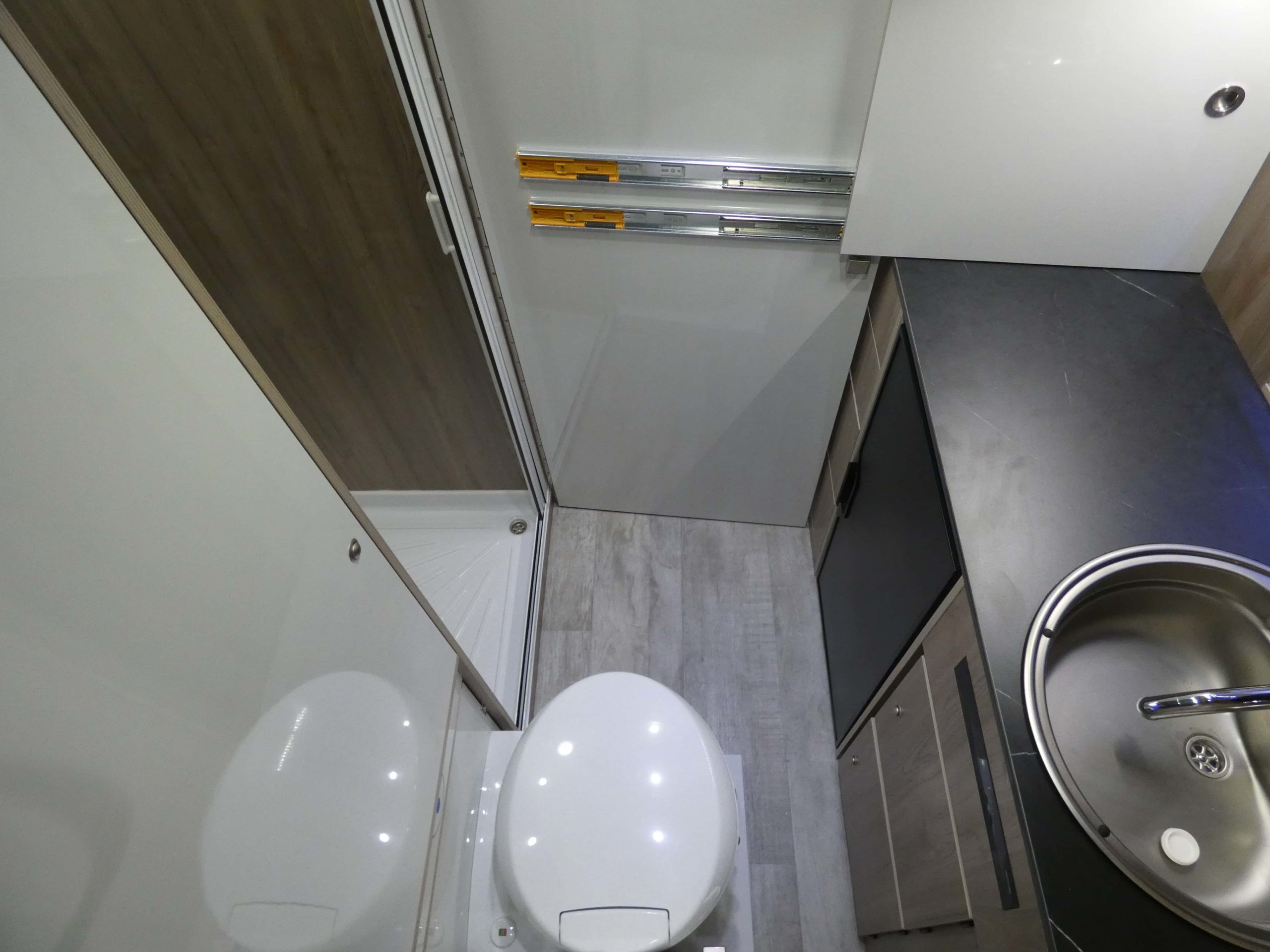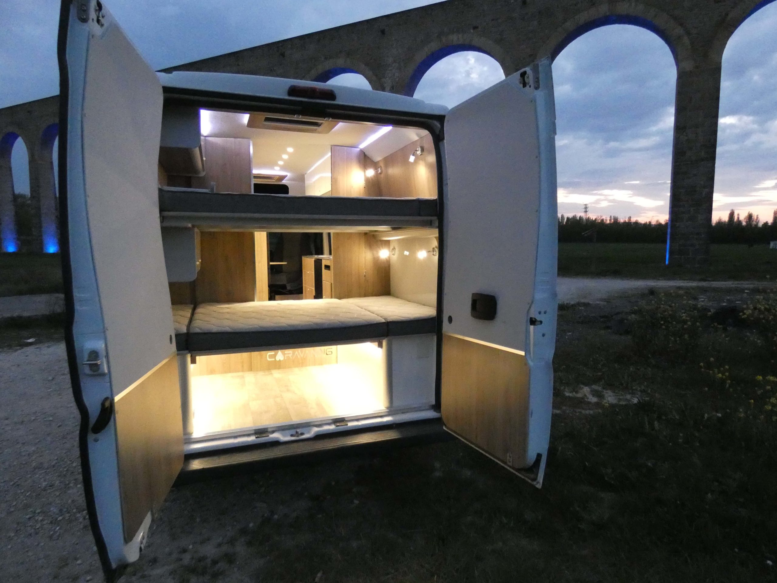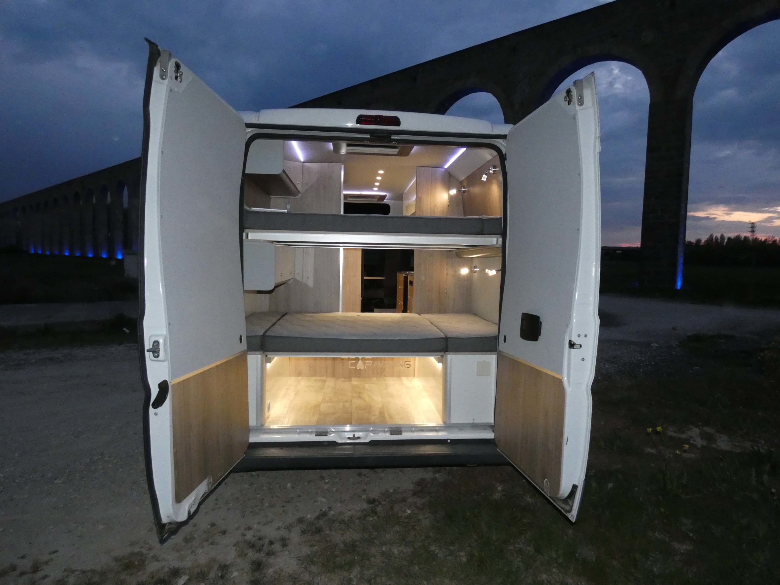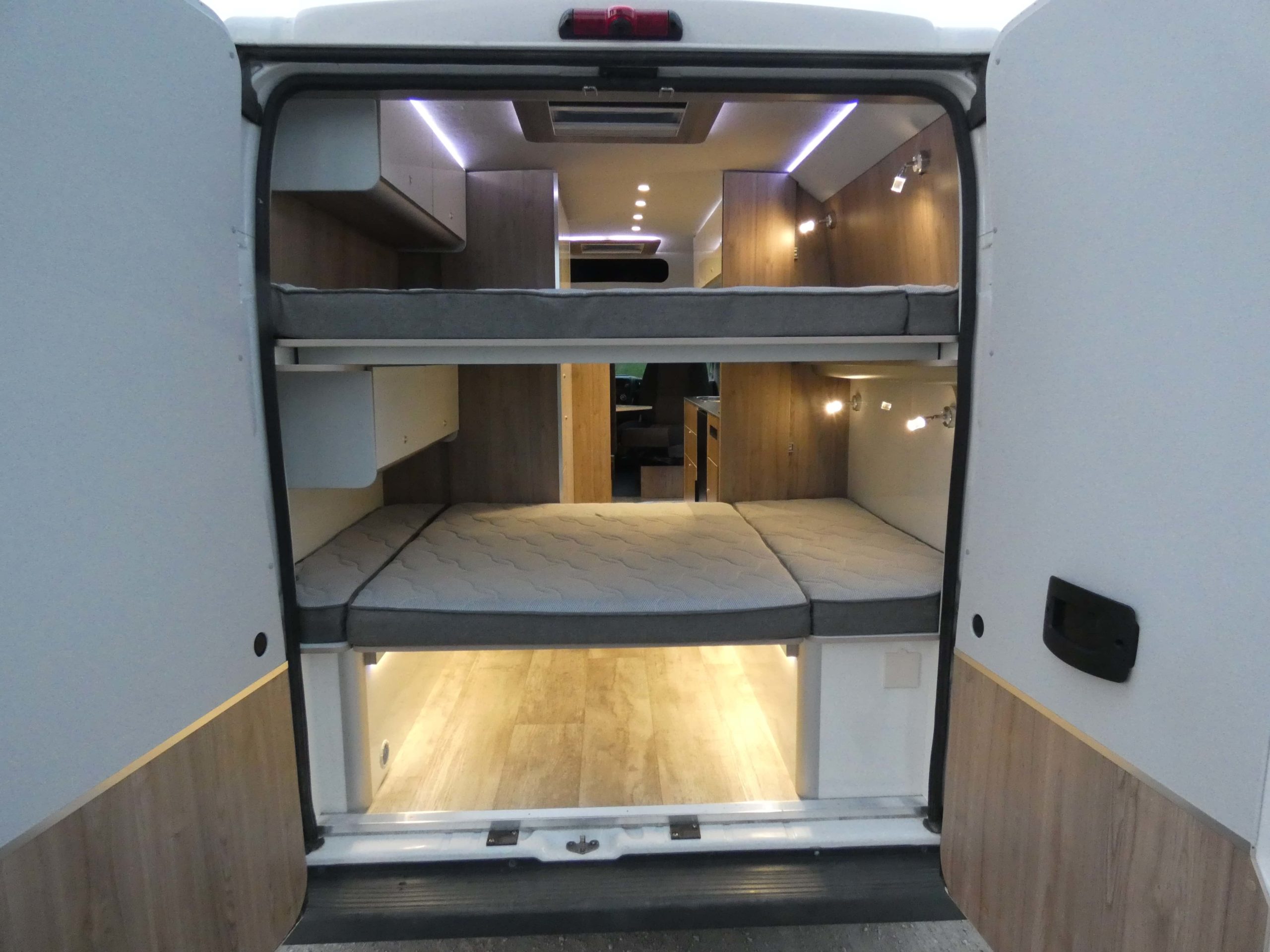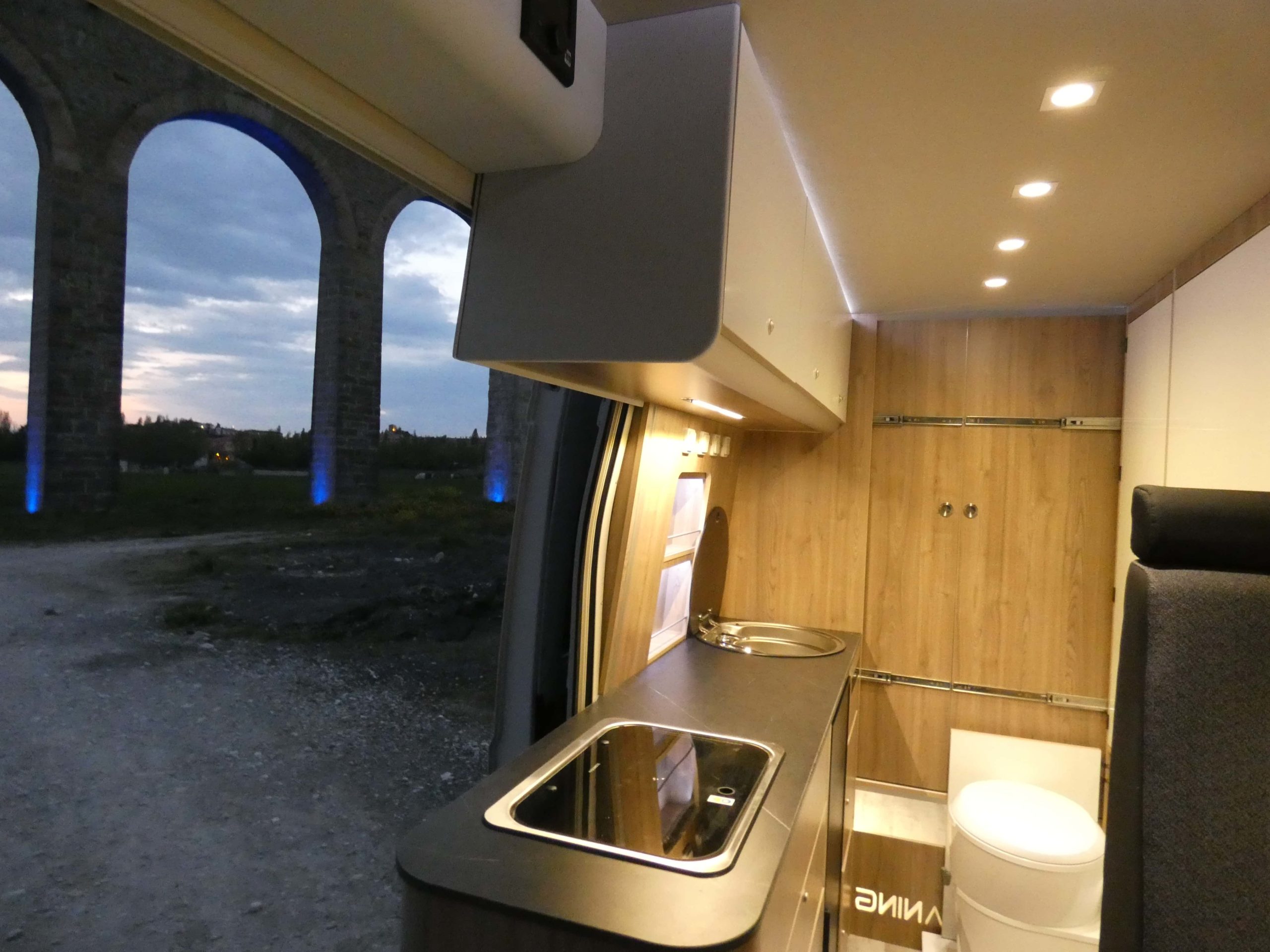 Esta furgo se caracteriza por su iluminación indirecta, aqui también incluimos nuestro BAÑO/VESTIDOR DE 2 METROS CUADRADOS, para ello utilizamos el pasillo gracias a las puertas correderas que nos separan de las camas y la puerta de la cabina de ducha que nos cierra hacia el comedor, de esta manera conseguimos un armario ropero de 40 cm de ancho, y una cabina de ducha de 60 x 65 cm dotada de mampara enrollable, hemos convertido en móvil un wc fijo con cassette extraíble desde el exterior, al dotarlo de movilidad lo podemos guardar cuando no lo usamos, el fregadero hace también las veces de lavabo si así lo deseamos, cuando no tenemos la puerta de la ducha abierta conseguimos una encimera de 170 cm de largo para cocinar de una manera comodísima.