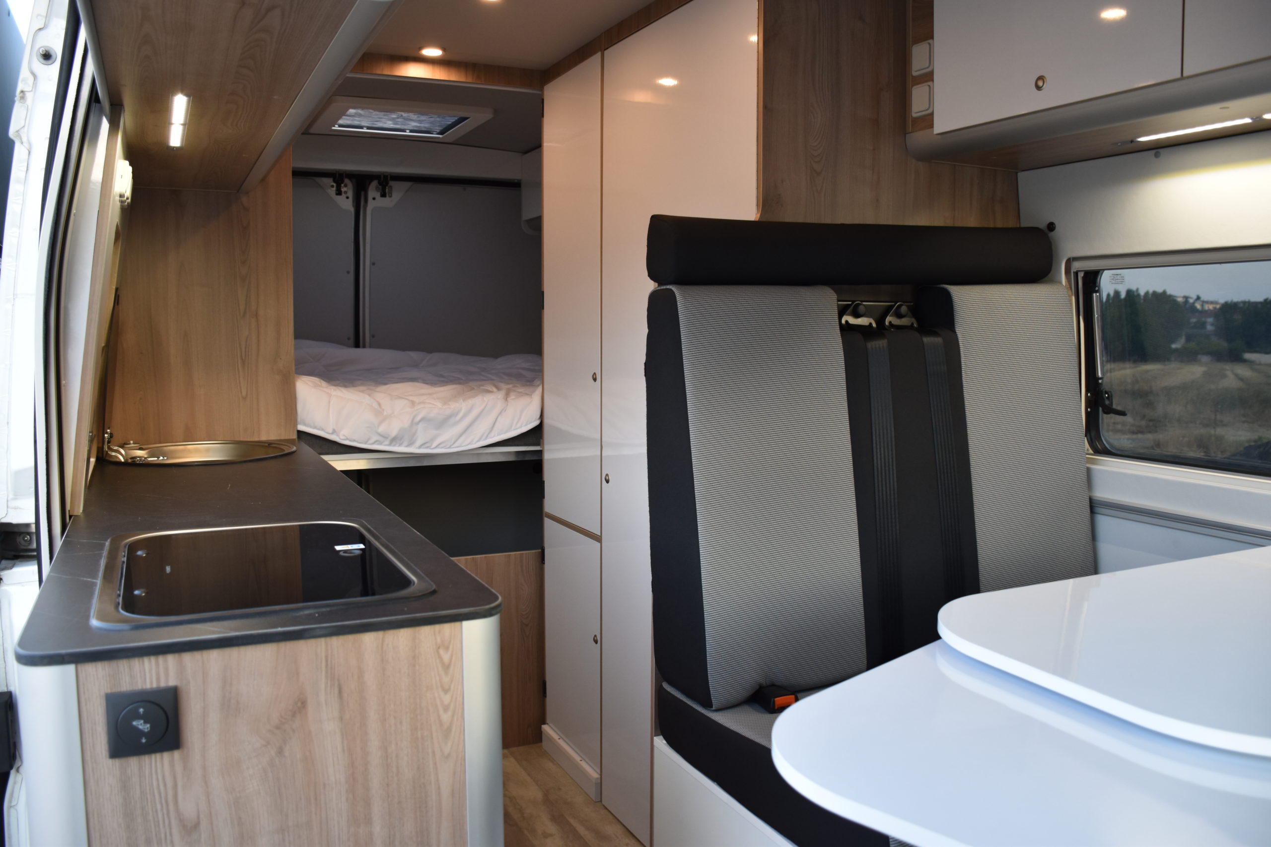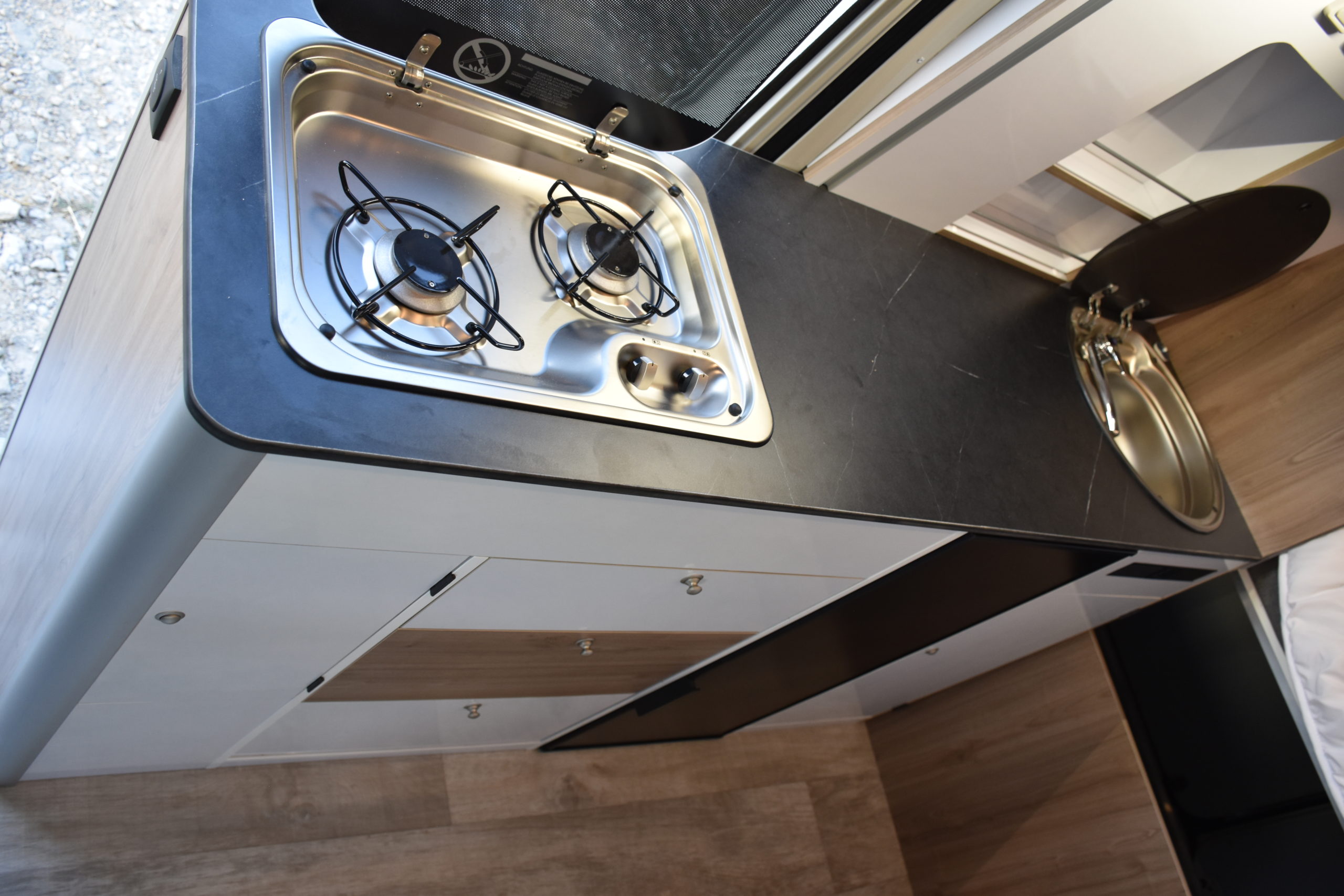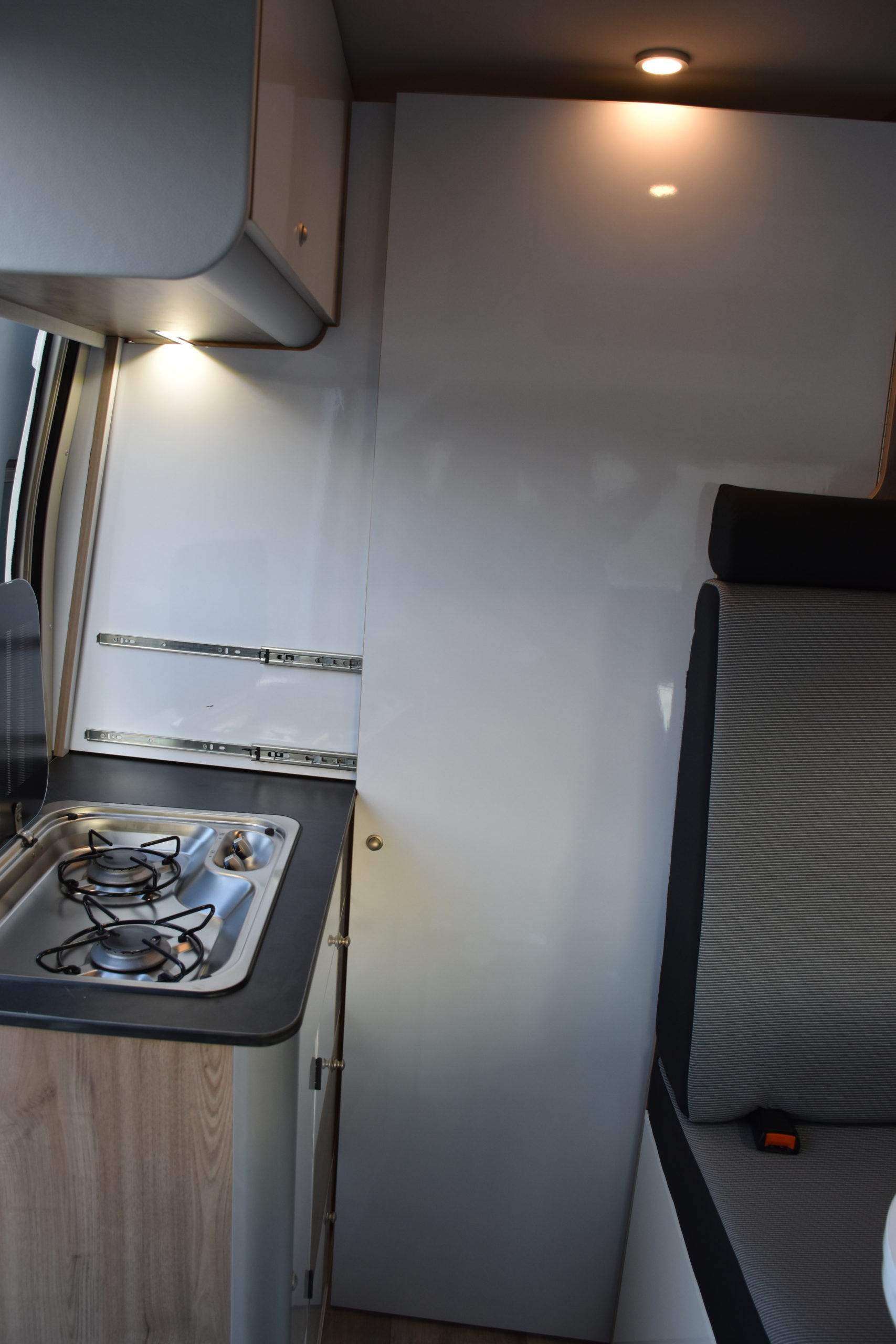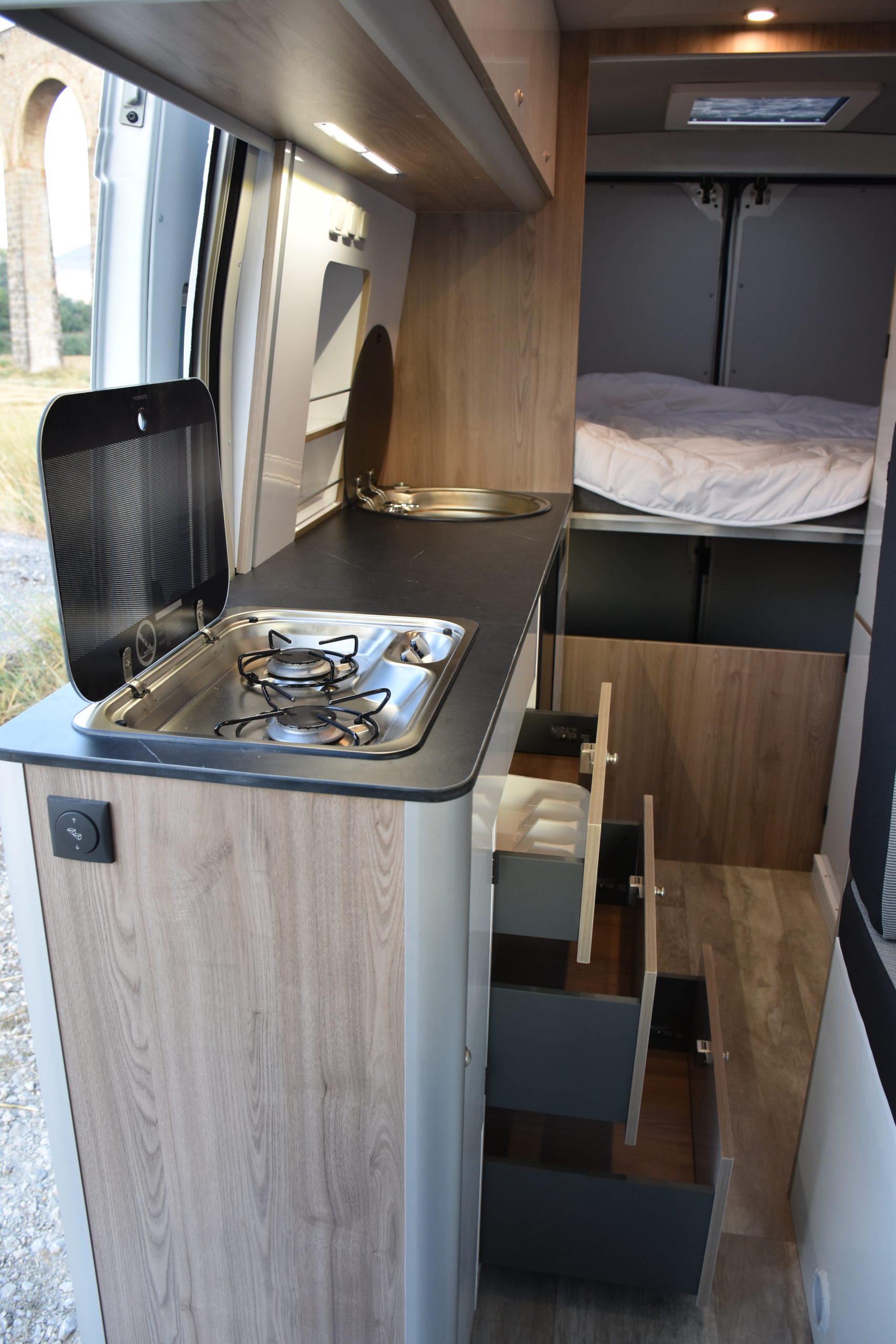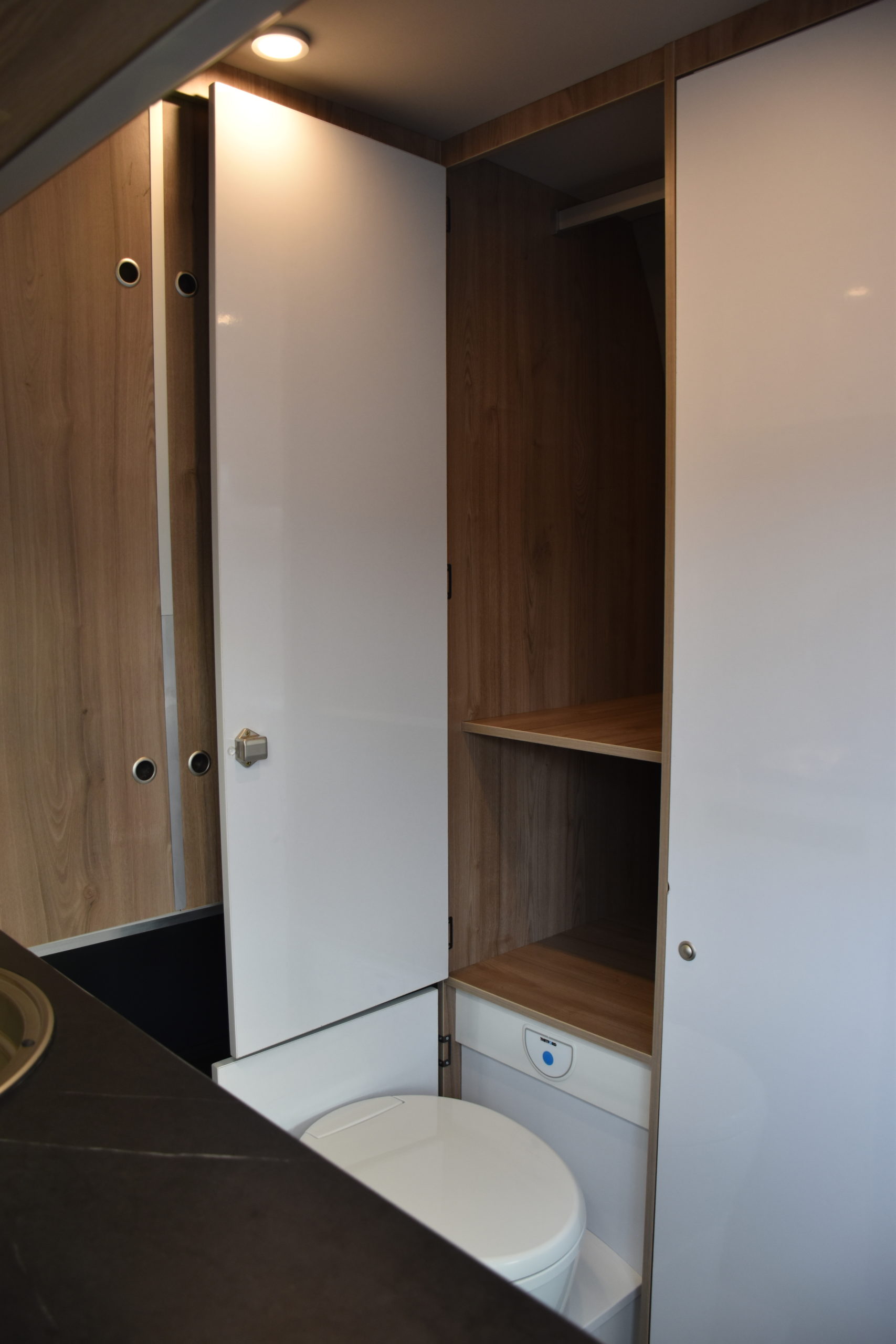 En esta preparacion le daos una vuelta de tuerca a nuestro BAÑO/VESTIDOR DE 2 METROS CUADRADOS, para ello utilizamos el pasillo gracias a las puertas correderas que nos separan de las camas y la puerta de la cabina de ducha que nos cierra hacia el comedor, de esta manera conseguimos un armario ropero de 40 cm de ancho, y una cabina de ducha de 60 x 65 cm dotada de mampara enrrollable, hemos convertido en móvil un wc fijo con cassette extraible desde el exterior, al dotarlo de movilidad lo podemos guardar cuando no lo usamos, el fregadero hace también las veces de lavabo si así lo deseamos, cuando no tenemos la puerta de la ducha abierta conseguimos una encimera de 170 cm de largo para cocinar de una manera comodísima.