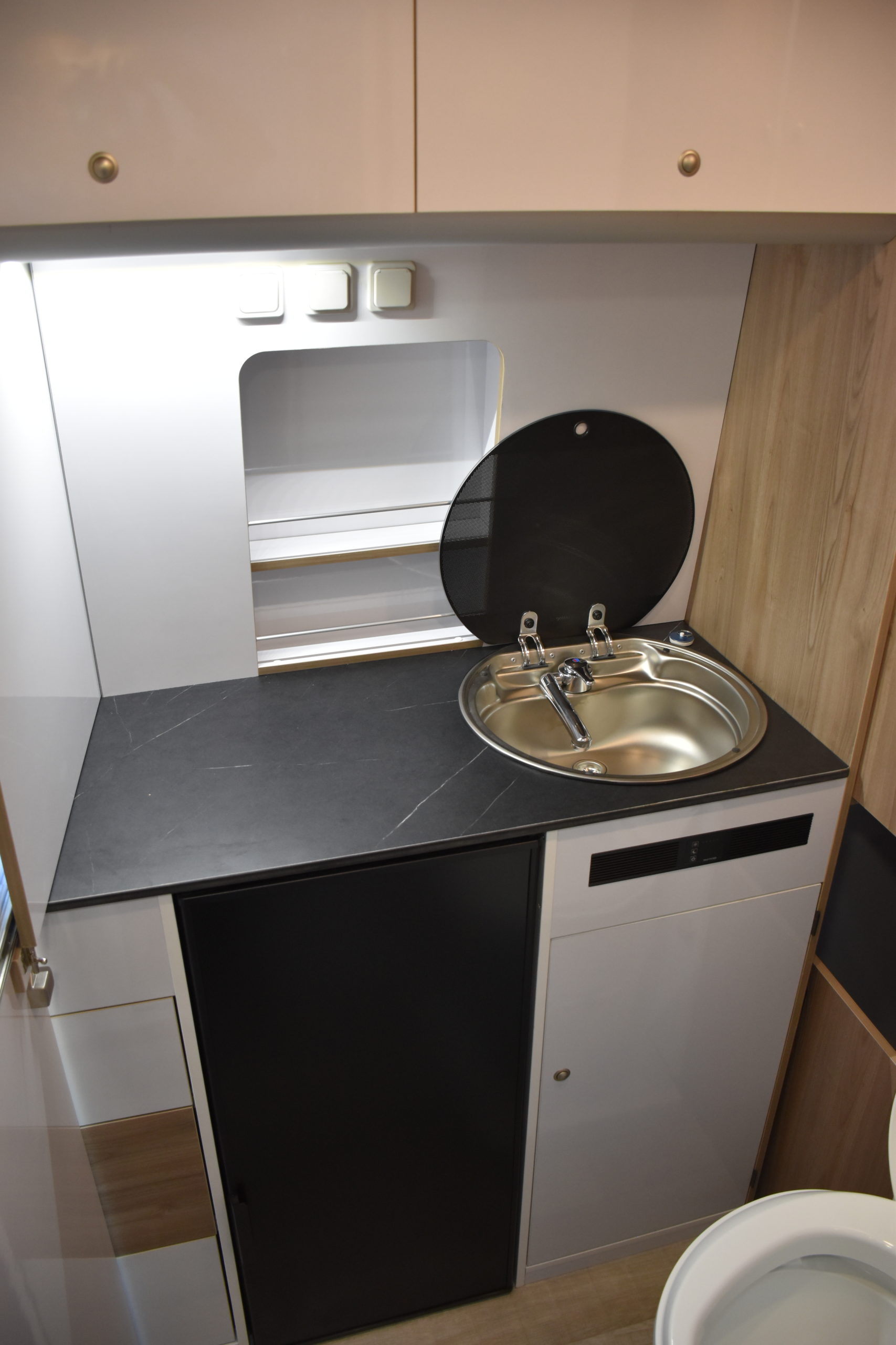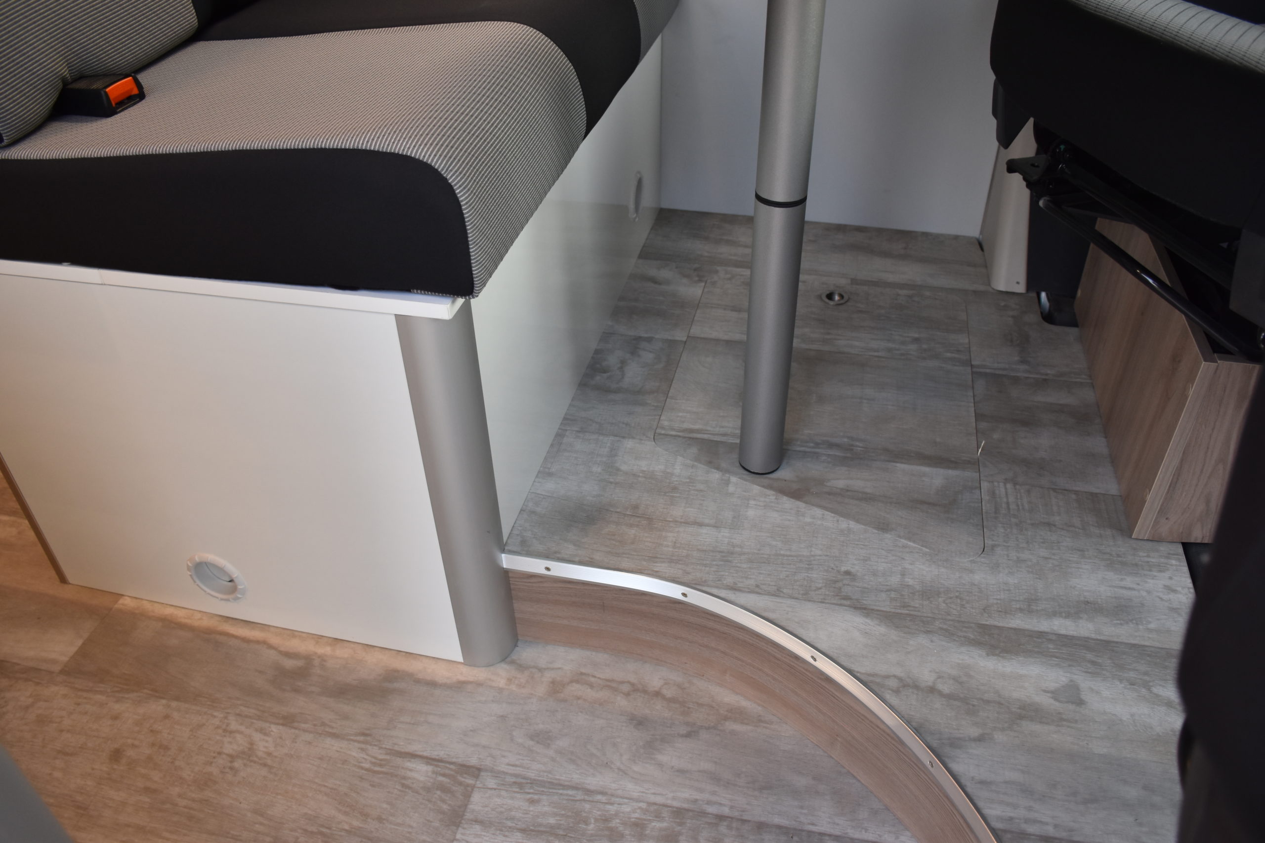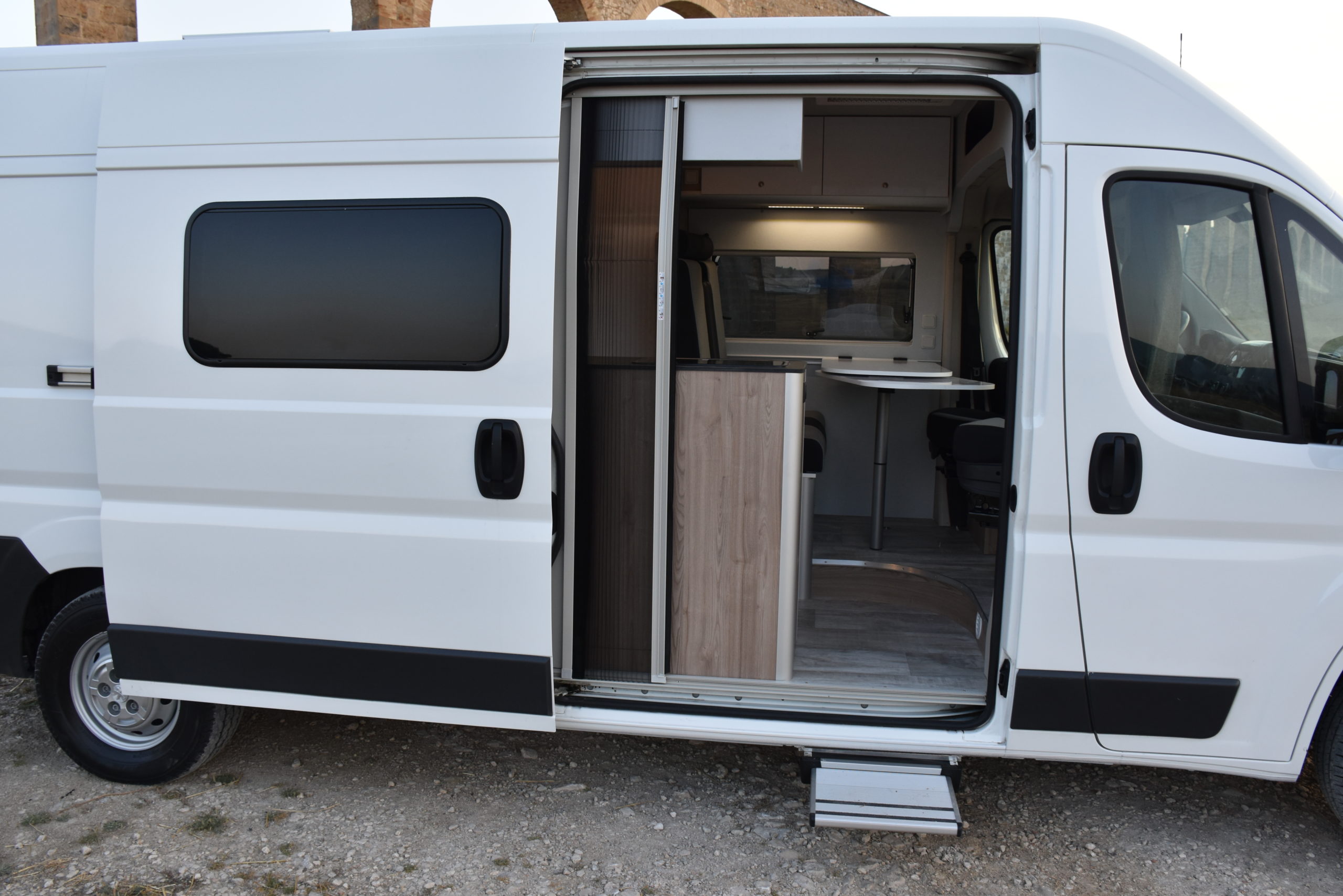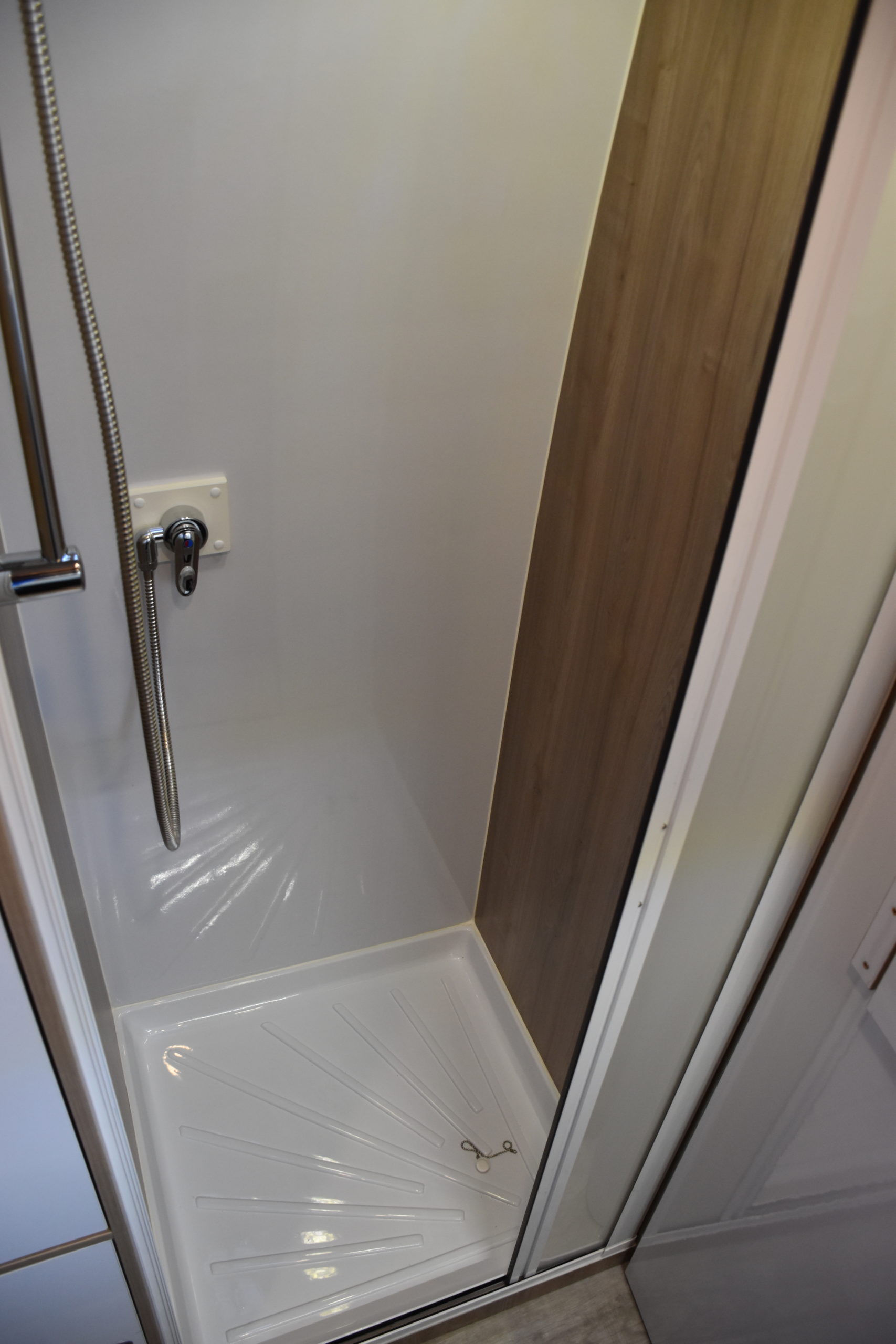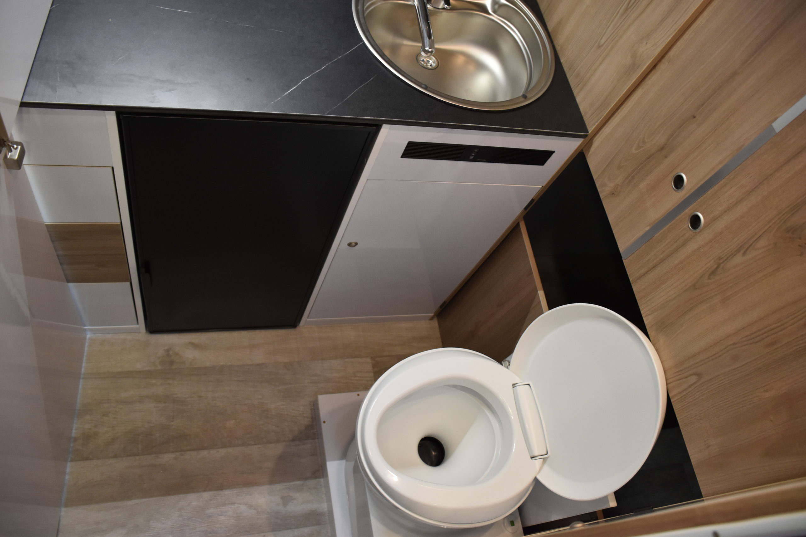 En esta preparacion le daos una vuelta de tuerca a nuestro BAÑO/VESTIDOR DE 2 METROS CUADRADOS, para ello utilizamos el pasillo gracias a las puertas correderas que nos separan de las camas y la puerta de la cabina de ducha que nos cierra hacia el comedor, de esta manera conseguimos un armario ropero de 40 cm de ancho, y una cabina de ducha de 60 x 65 cm dotada de mampara enrrollable, hemos convertido en móvil un wc fijo con cassette extraible desde el exterior, al dotarlo de movilidad lo podemos guardar cuando no lo usamos, el fregadero hace también las veces de lavabo si así lo deseamos, cuando no tenemos la puerta de la ducha abierta conseguimos una encimera de 170 cm de largo para cocinar de una manera comodísima.