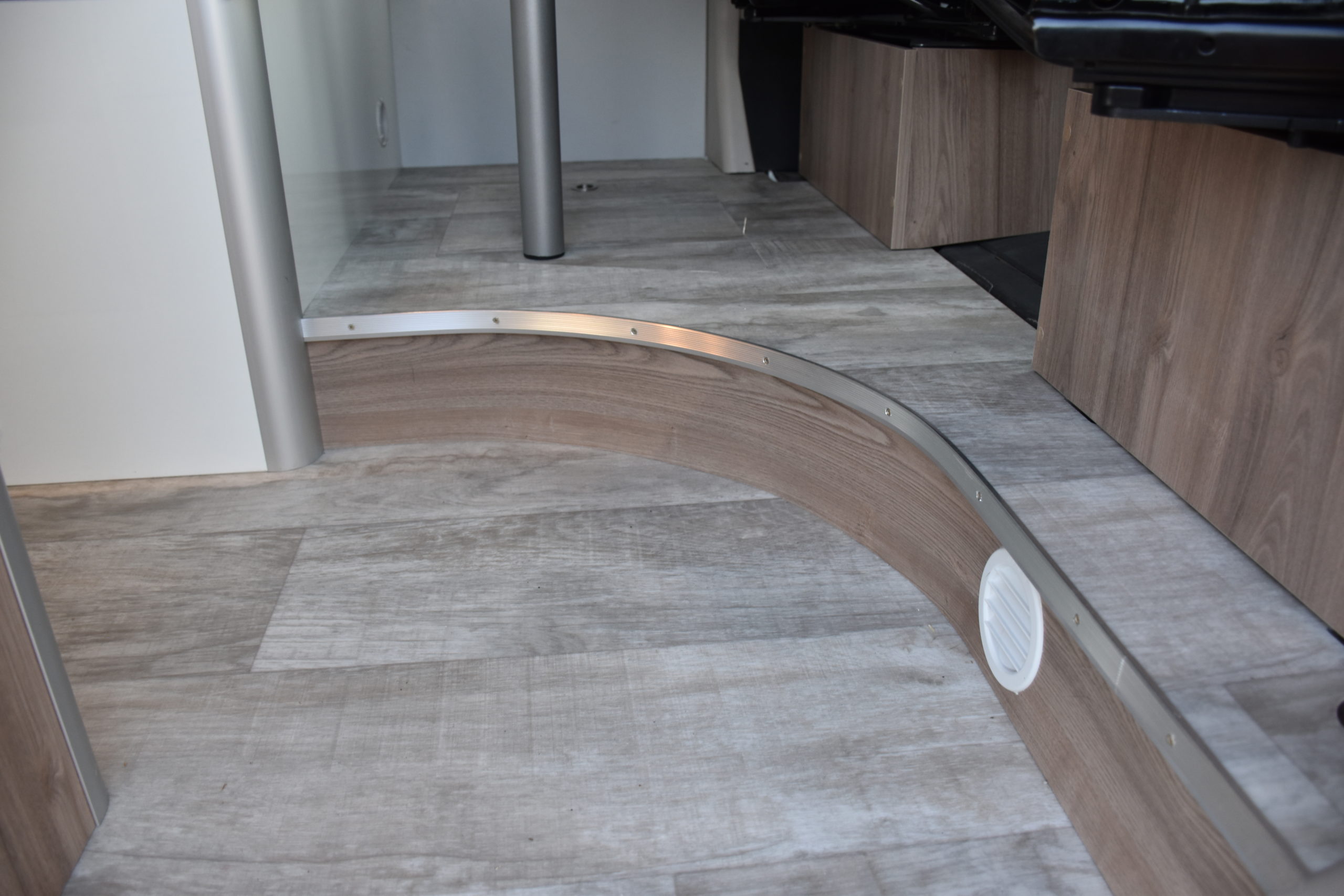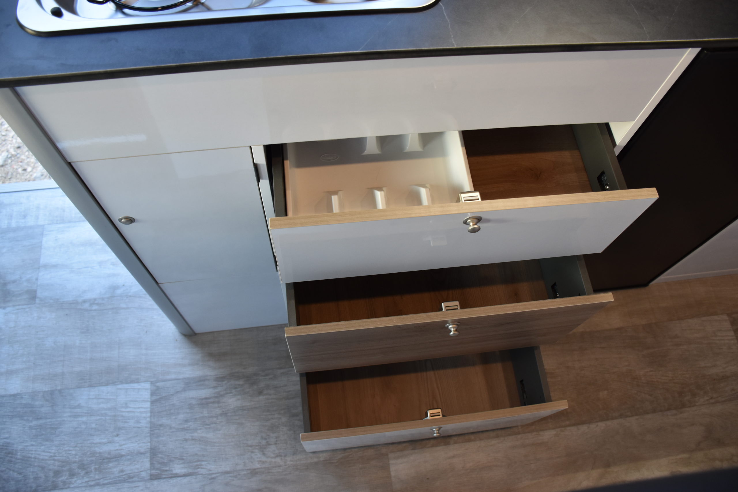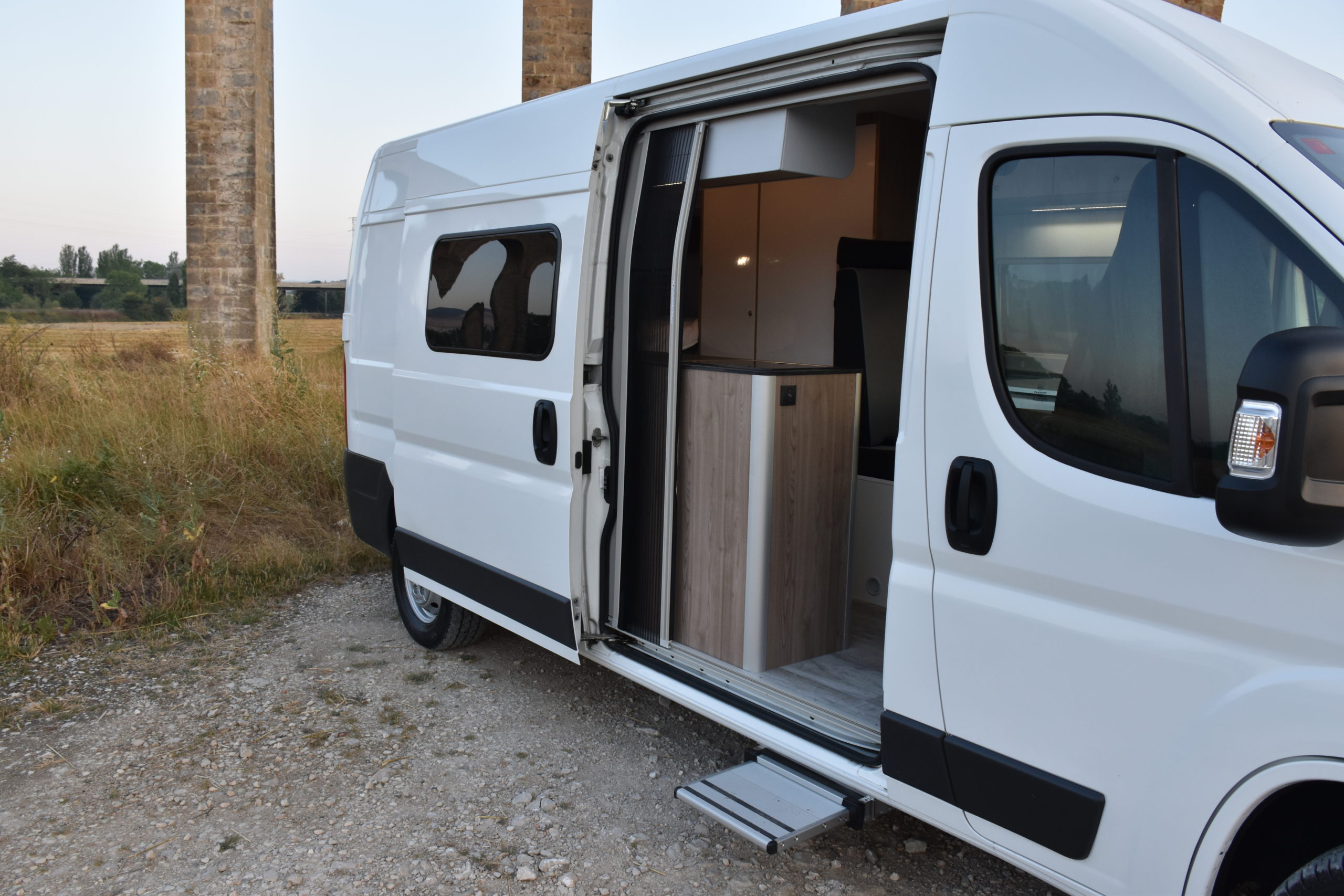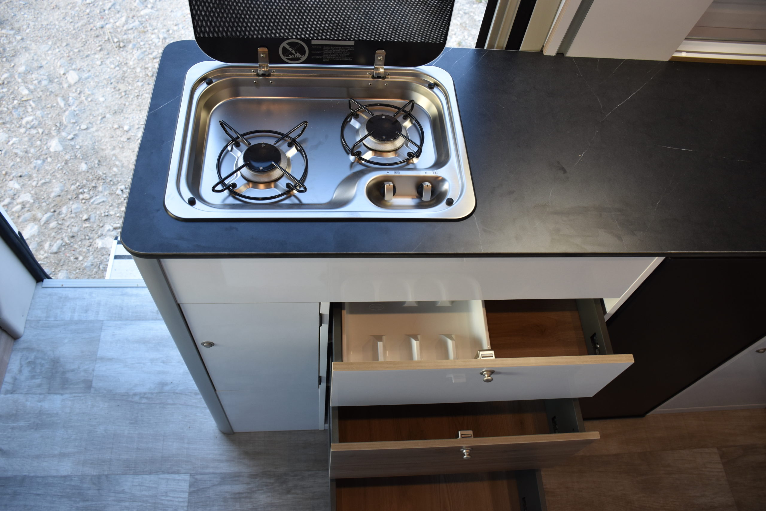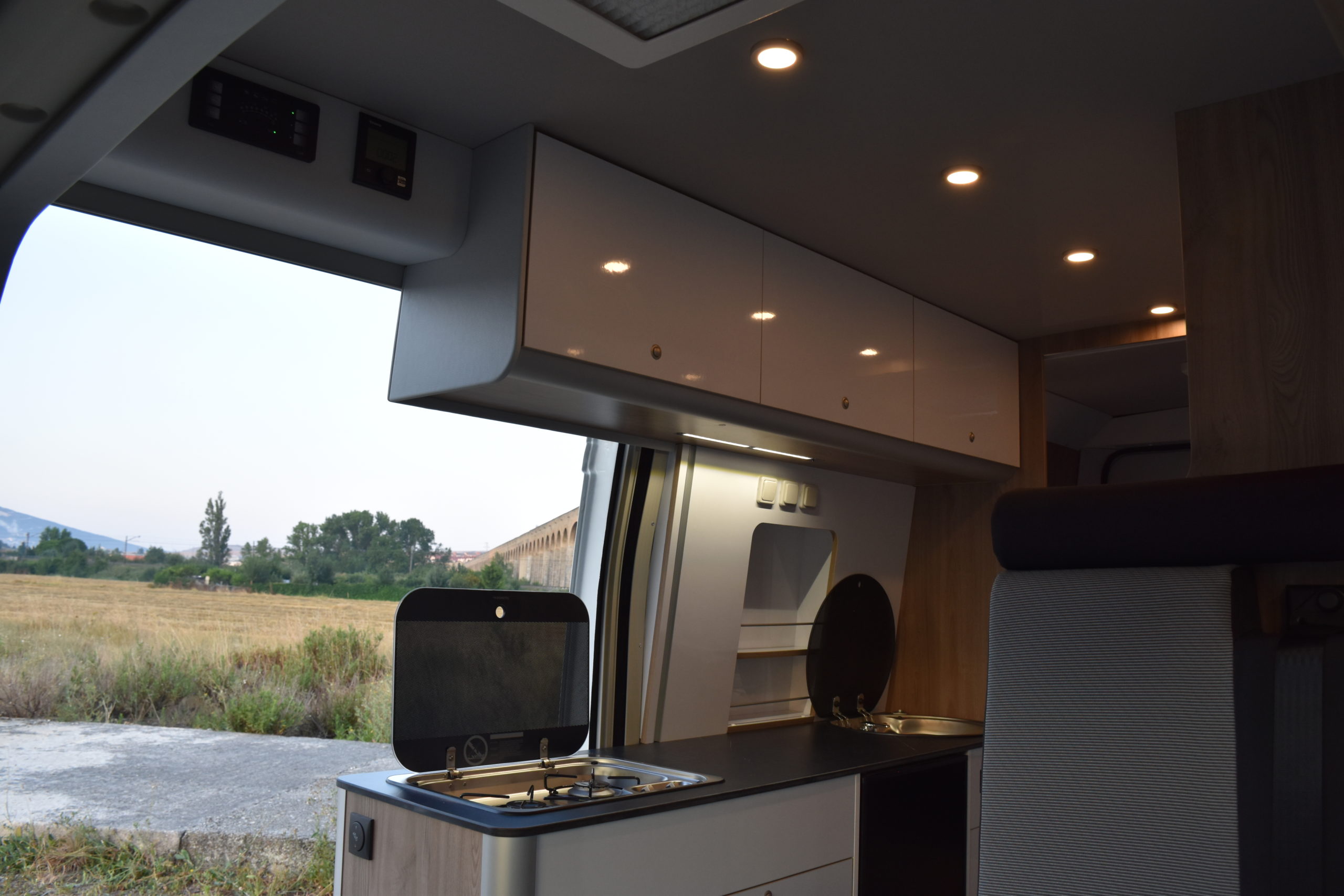 En esta preparacion le daos una vuelta de tuerca a nuestro BAÑO/VESTIDOR DE 2 METROS CUADRADOS, para ello utilizamos el pasillo gracias a las puertas correderas que nos separan de las camas y la puerta de la cabina de ducha que nos cierra hacia el comedor, de esta manera conseguimos un armario ropero de 40 cm de ancho, y una cabina de ducha de 60 x 65 cm dotada de mampara enrrollable, hemos convertido en móvil un wc fijo con cassette extraible desde el exterior, al dotarlo de movilidad lo podemos guardar cuando no lo usamos, el fregadero hace también las veces de lavabo si así lo deseamos, cuando no tenemos la puerta de la ducha abierta conseguimos una encimera de 170 cm de largo para cocinar de una manera comodísima.